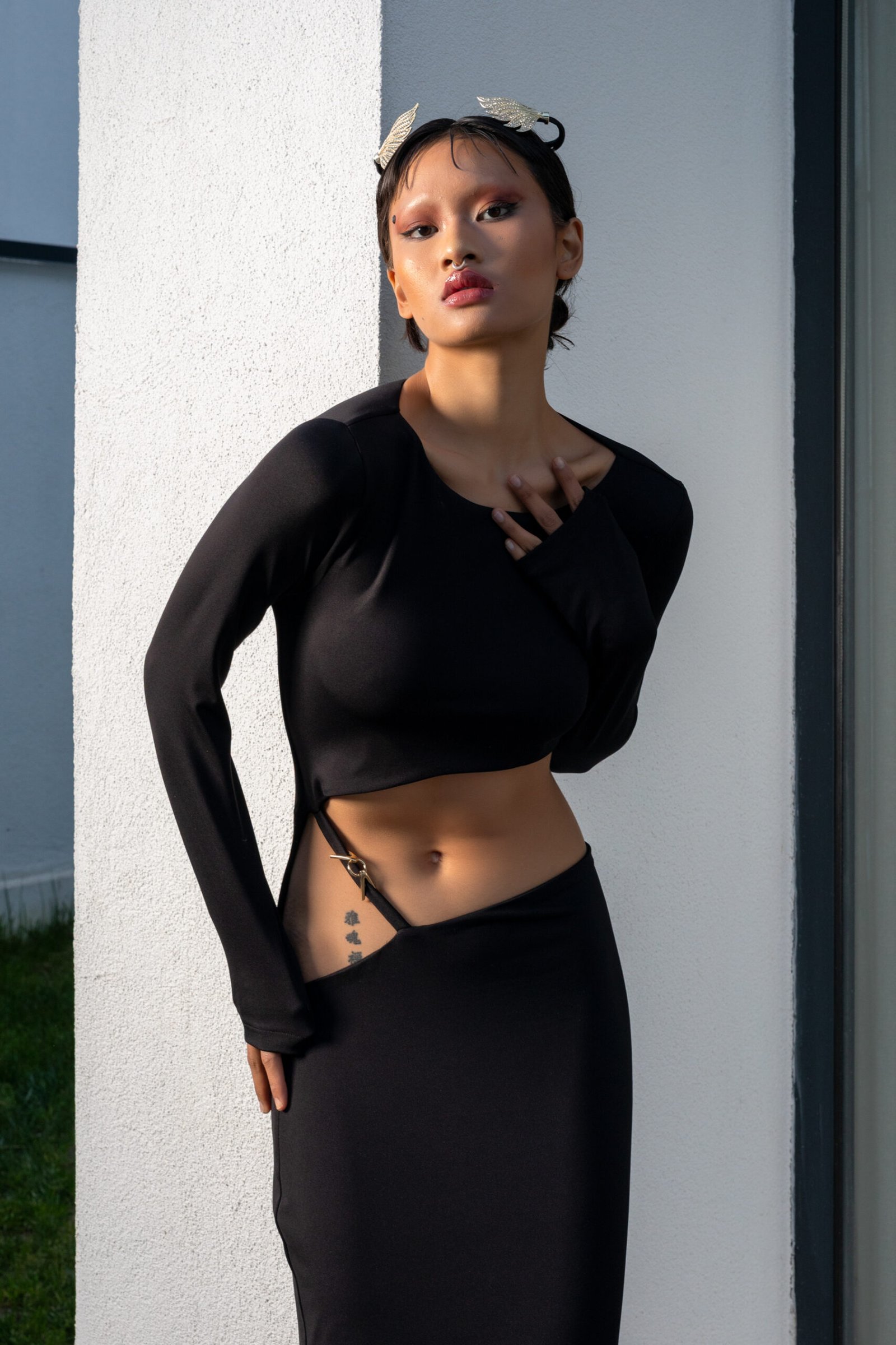 Yüksek bel detayı ve bel kısmındaki metal halka dokunuşu, feminen çizgileri vurgularken aynı zamanda güçlü bir duruş sergiler. Vücuda tam oturan bu özel kesim, hareket ettikçe bedenin doğal zarafetini ön plana çıkarır.